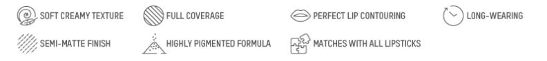 The soft-textured pencil defines lips, helps to keep lipstick inside the lipline and adds a vibrant pop of colour to your lips. Strong colour pay-off, smooth, silky glide, long-lasting and modern and sleek design.